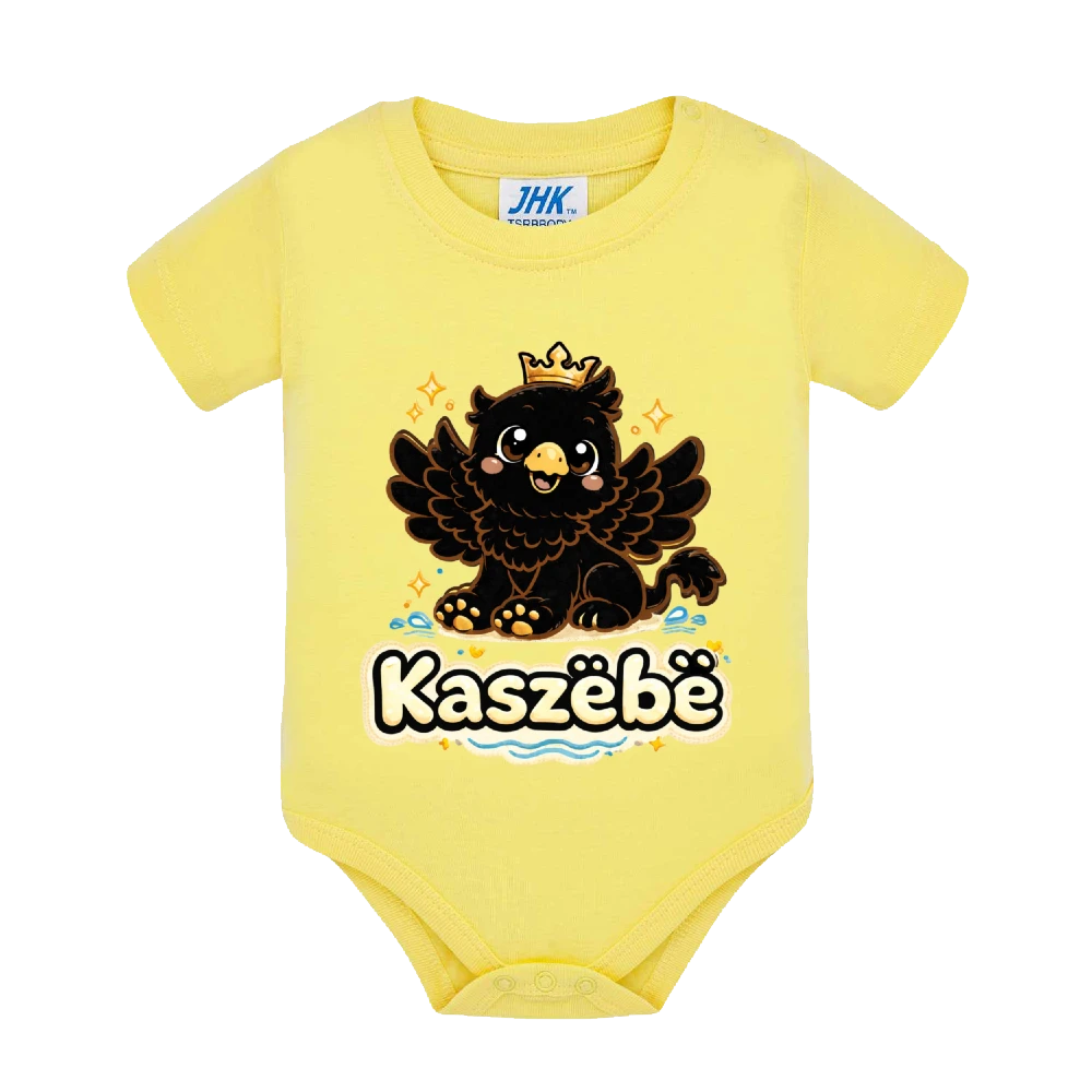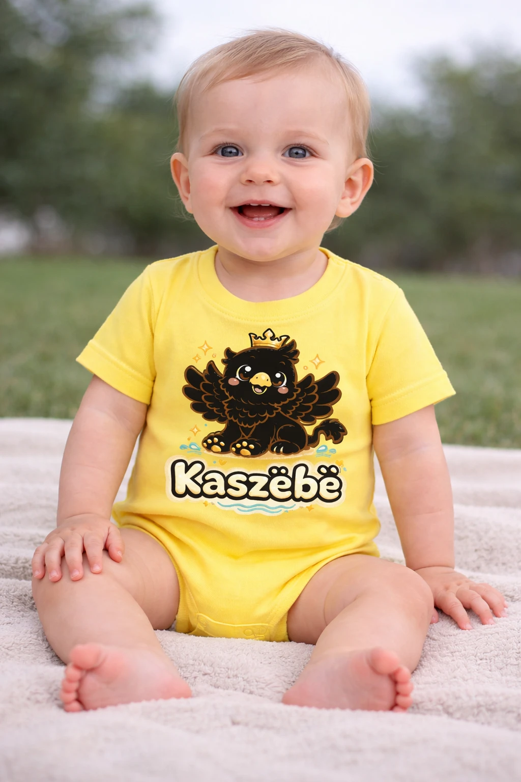 Urocze body dziecięce z kolorowym nadrukiem Gryfusia i napisem „Kaszëbë”. Przyjazna, bajkowa grafika przyciąga uwagę i nadaje ubranku wyjątkowego charakteru inspirowanego Kaszubami.