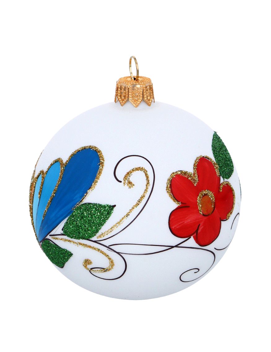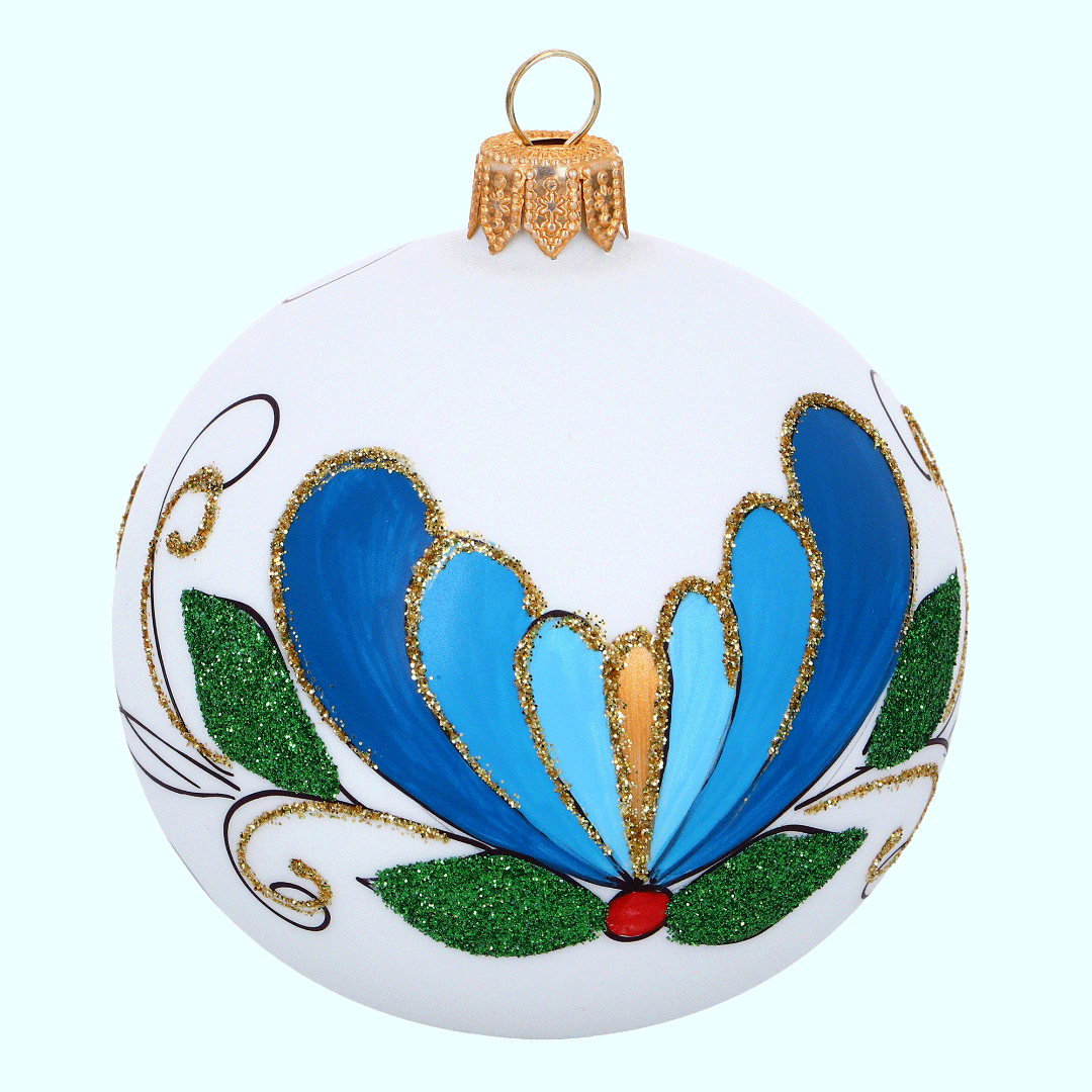 Piękna, ręcznie malowana bombka choinkowa z akcentem haftu kaszubskiego - palmetą. Świetny prezent na Boże Narodzenie dla wszystkich tych, którym są bliskie Kaszuby i piękne folkowe wzory. Ręcznie malowane elementy haftu kaszubskiego mogą nieznacznie różnić się pomiędzy poszczególnymi egzemplarzami.