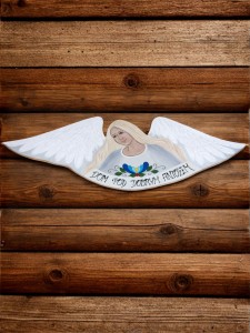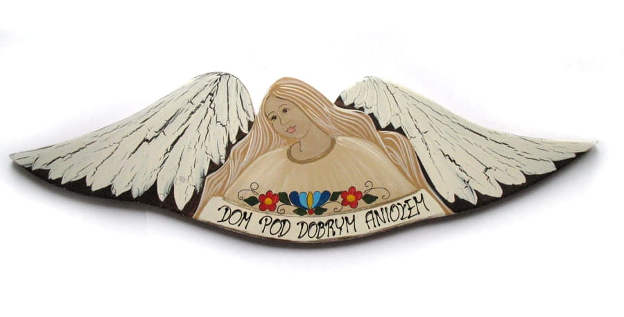 Dom pod dobrym aniołem - dużej wielkości, ręcznie malowany na drewnie, zdobiony elementem kaszubskich haftów.