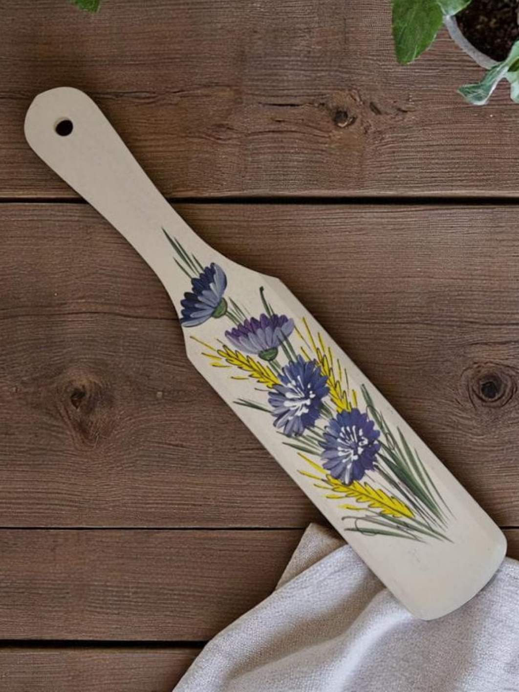 Drewniana łopatka ozdobna - ręcznie malowana z wzorami chabrów - kwiatów obecnych w hafcie kociewskim.
