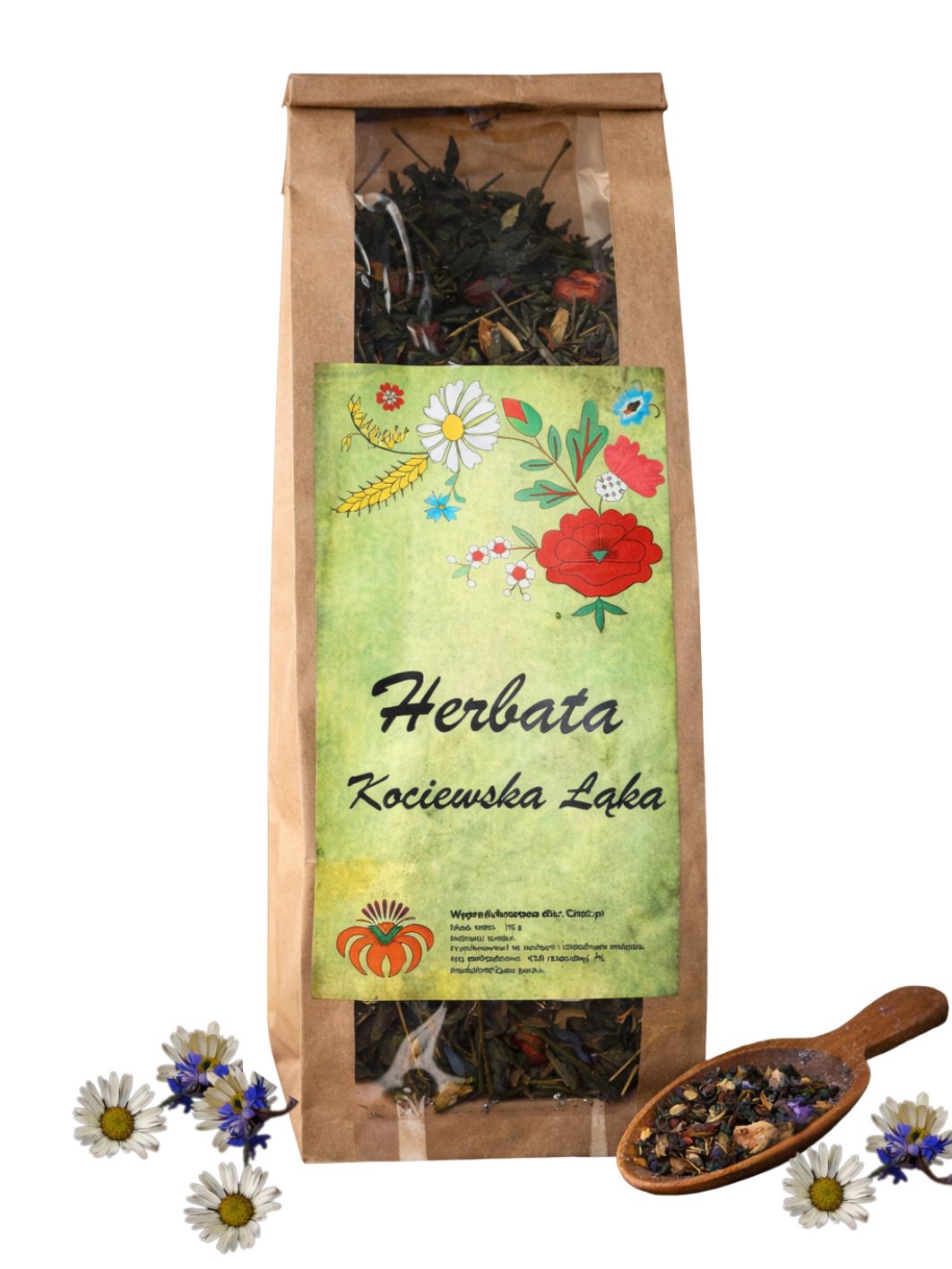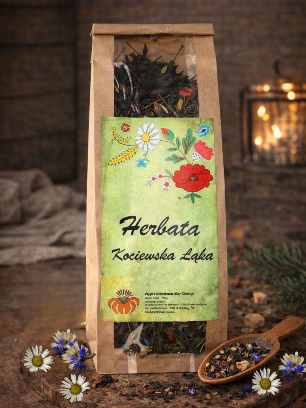 Nazwa herbaty "Kociewska łąka" nawiązuje do haftu kociewskiego zwanego "haftem ziemi" ze względu na występujące w nim kwiaty, które można znaleźć na łąkach - od maków, kłosów do chabrów. W skład mieszanki wchodzi wysokiej klasy chińska herbata dająca klarowny, miodowy napar z dodatkiem jagód goji. Jej owocowy skład powoduje, że jest „bombą” witaminową i świetnie wpływa na ludzki organizm. Jest bogatym źródłem witaminy C.