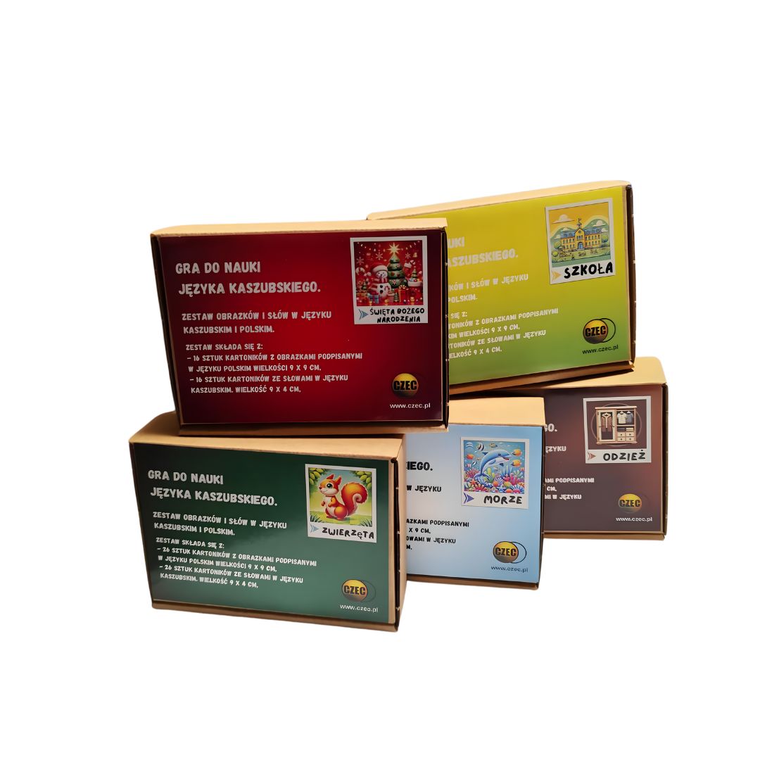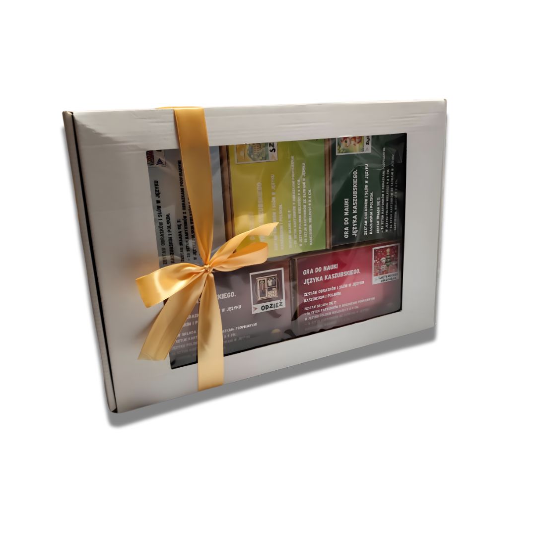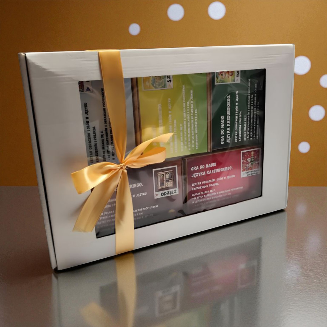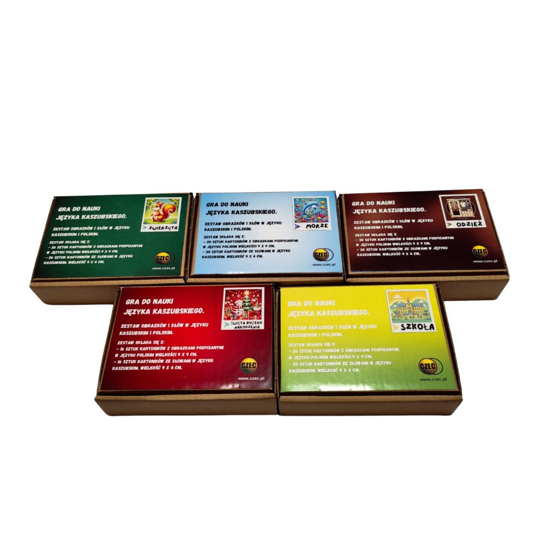 Zestaw 5 edukacyjnych gier językowych do nauki kaszubskiego dla dzieci. Kolorowe karty z ilustracjami i słowami po kaszubsku i polsku rozwijają pamięć, koncentrację i kompetencje językowe. Idealny do szkoły, domu i na prezent.