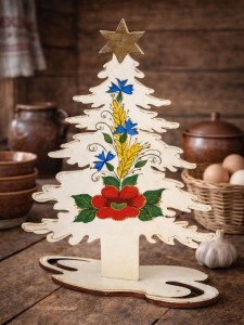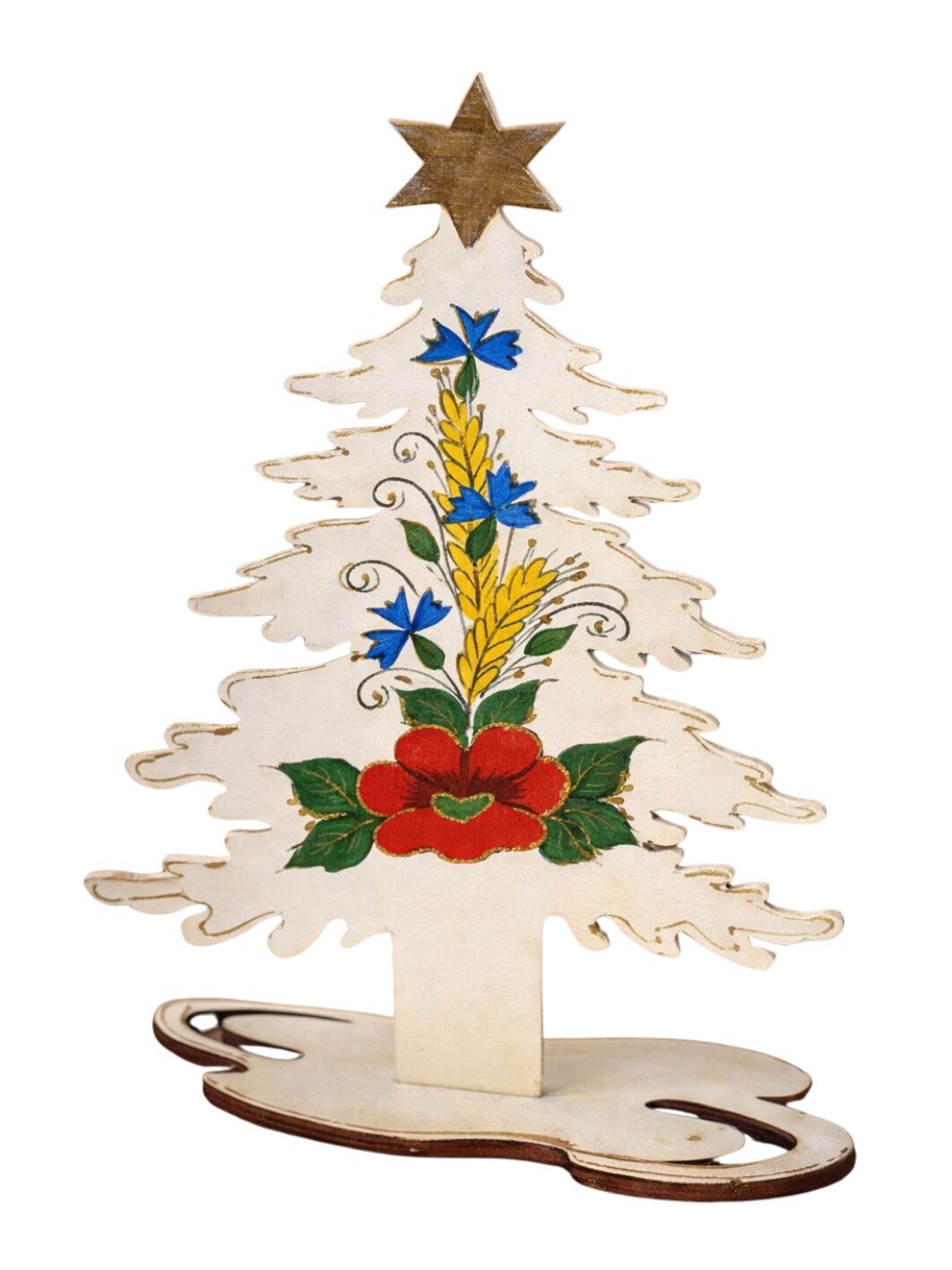 Drewniana choinka na podstawce ozdobiona ręcznie malowanymi elementami wzoru kociewskiego. Piękny wystrój Twego domu w kociewskim wzornictwie. Ręcznie malowane wzory mogą się nieznacznie różnić od zdjęcia na stronie.