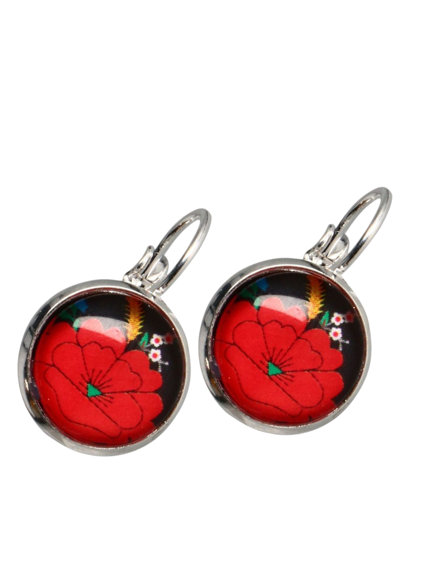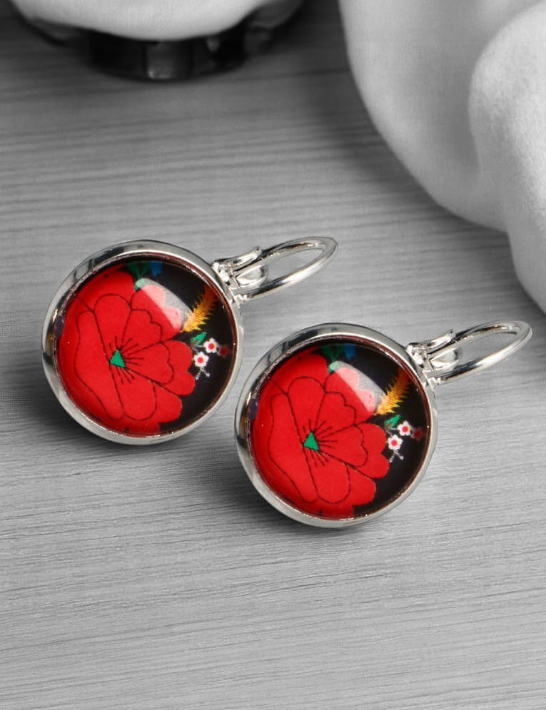 Wykonane z metalu w eleganckim, srebrnym kolorze, kolczyki zachwycają detalem i wyważoną formą. Centralnym punktem każdego z nich jest okrągła aplikacja z motywem nawiązującym do kociewskich wzorów, subtelnie wyeksponowana na czarnym tle. Kompozycję dopełnia delikatne szklane oczko, które nadaje całości lekkości i blasku, przyciągając światło przy każdym ruchu.