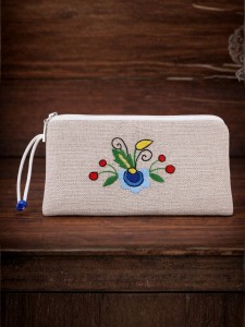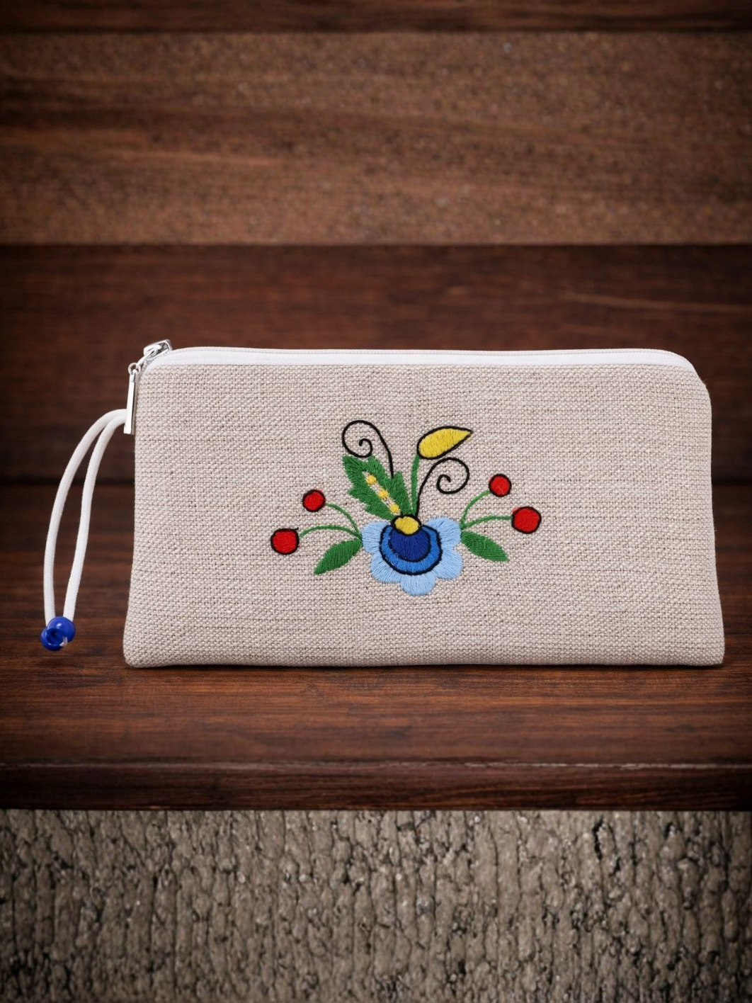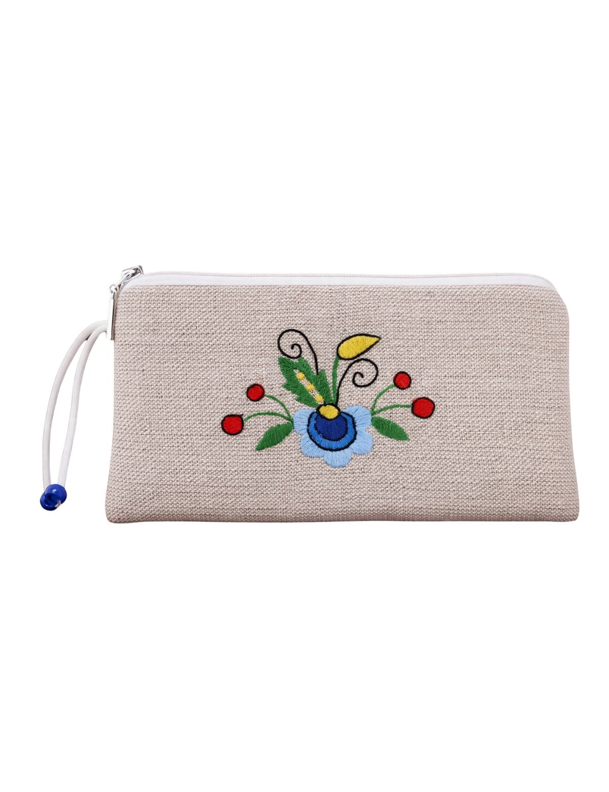 Lniana kosmetyczka z ręcznie haftowanymi wzorami kaszubskimi szkoły żukowskiej - siedmiobarwnej odmiany haftu kaszubskiego. Wzory na kosmetyczce wykonane haftem płaskim, cieniowanym. Zapinana zamkiem błyskawicznym.