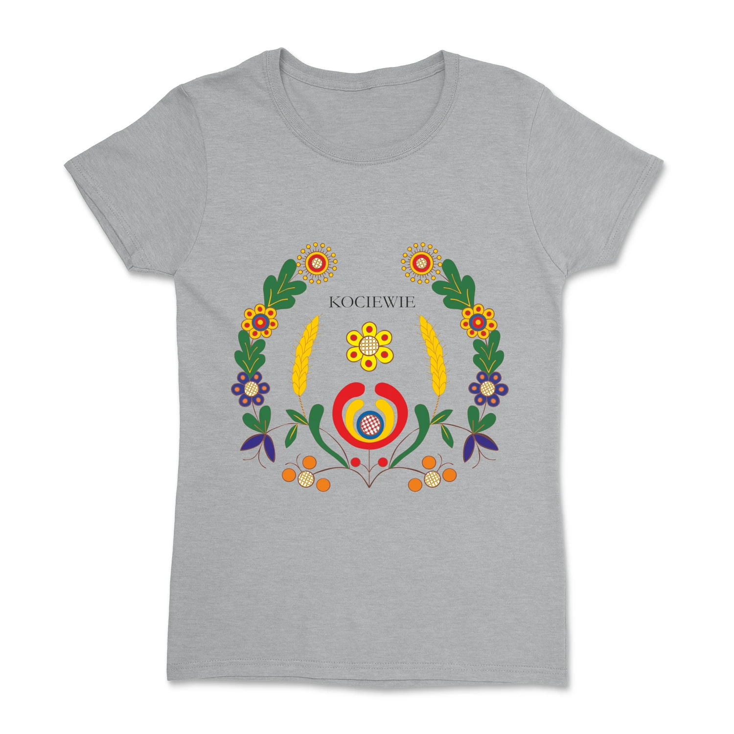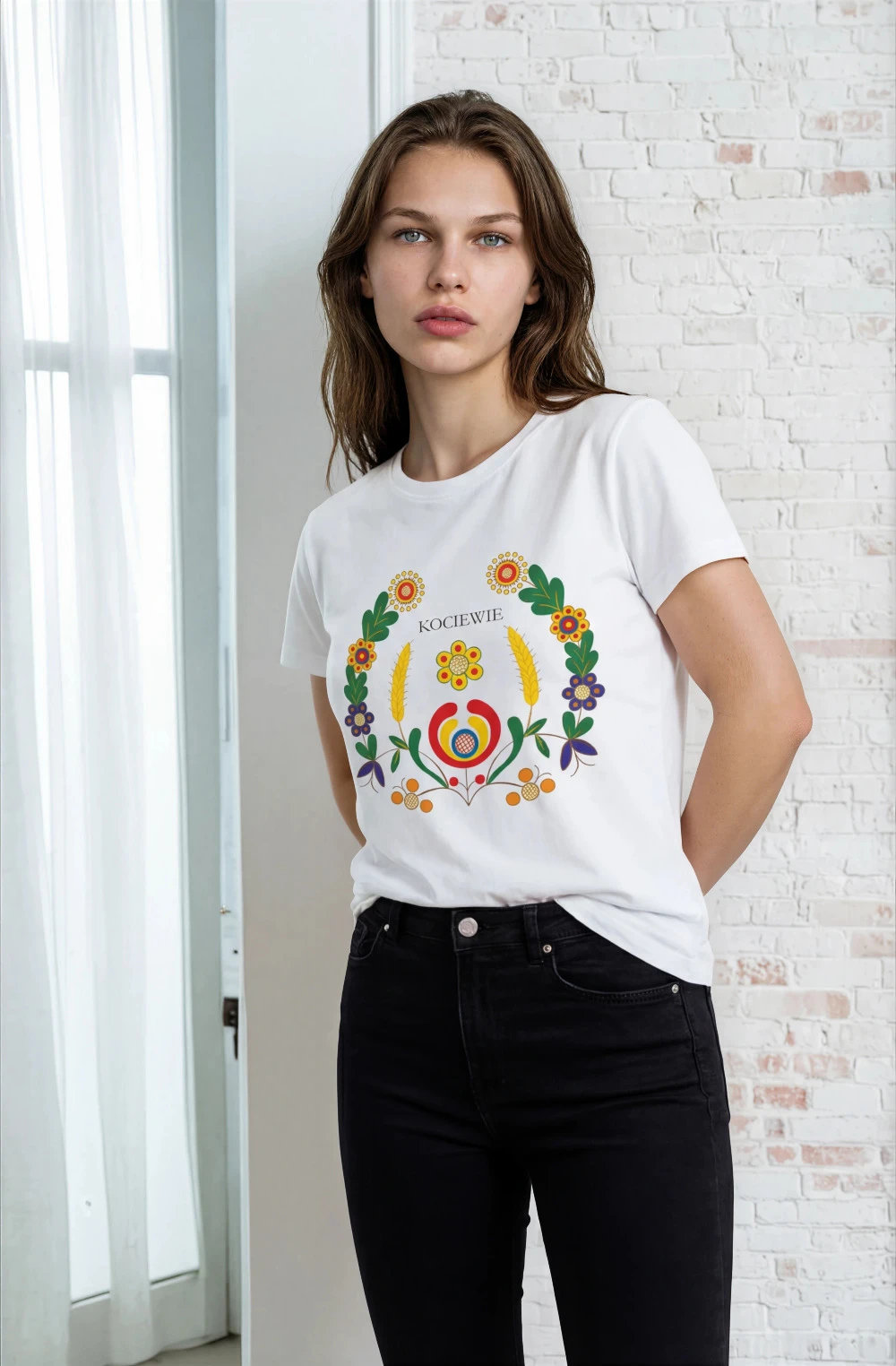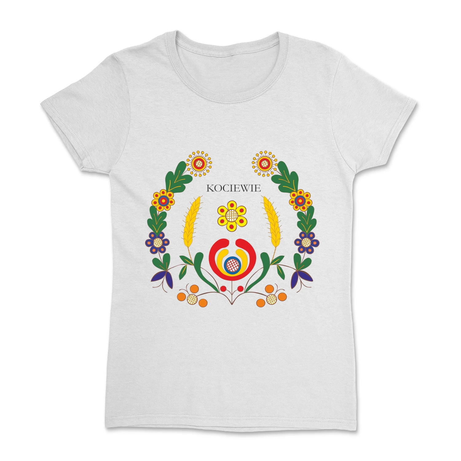 Damska koszulka z nadrukiem inspirowanym tradycyjnym haftem kociewskim oraz napisem „Kociewie”. Kolorowy, roślinny ornament nawiązuje do regionalnej sztuki ludowej, nadając koszulce wyjątkowy, folkowy charakter.