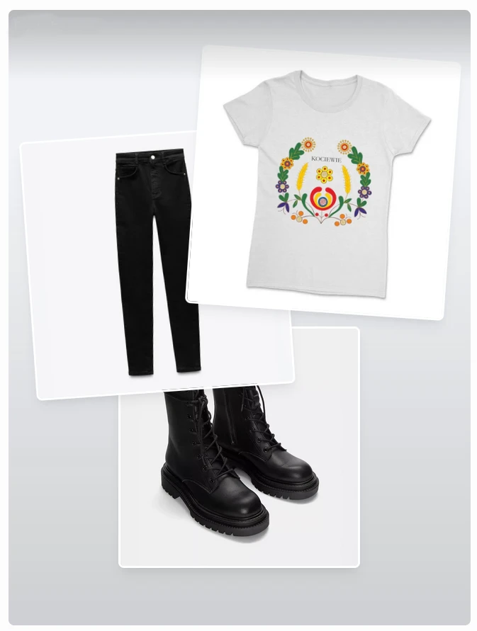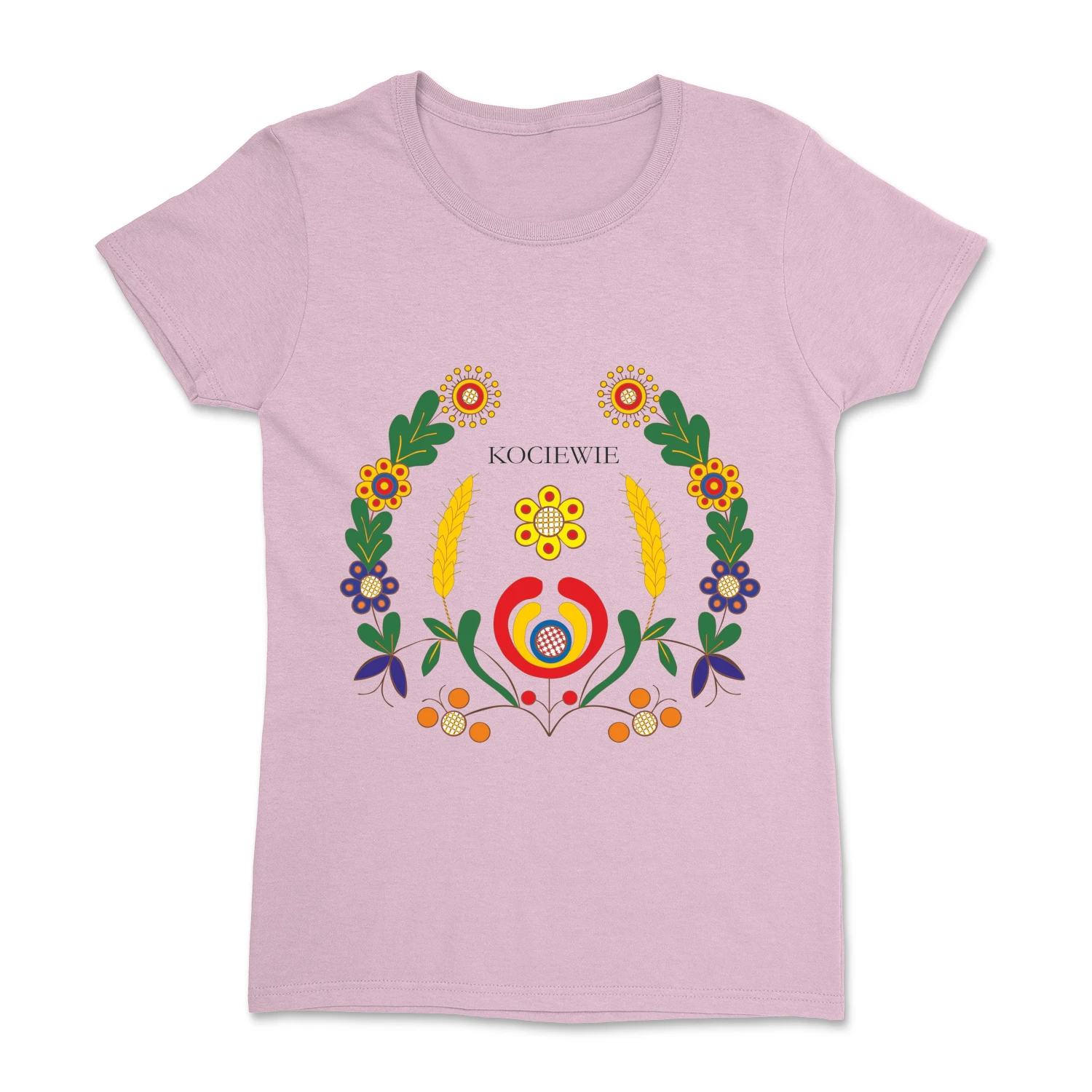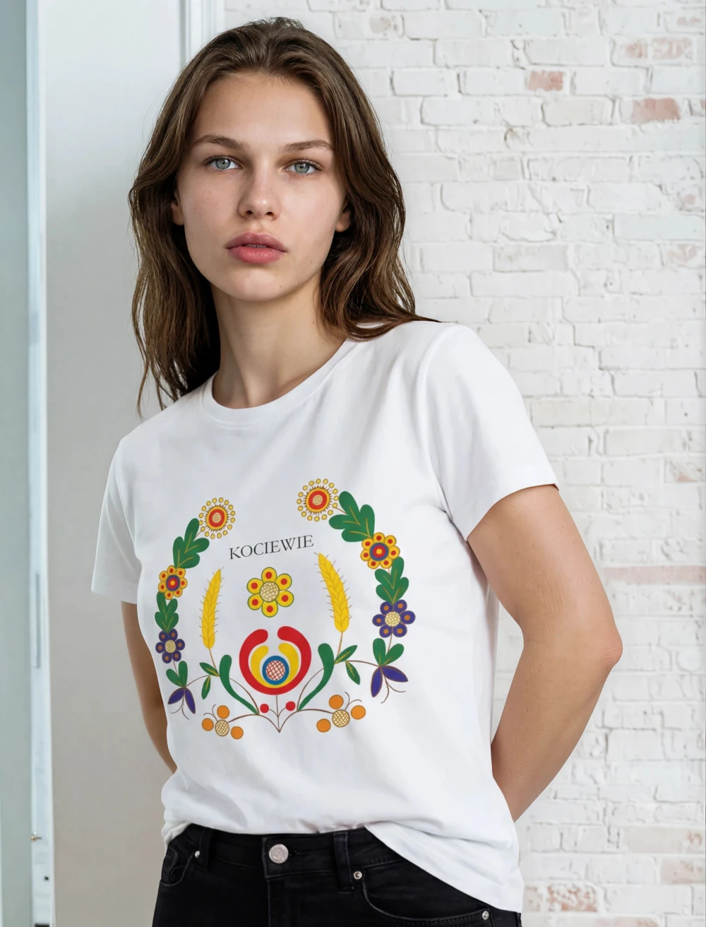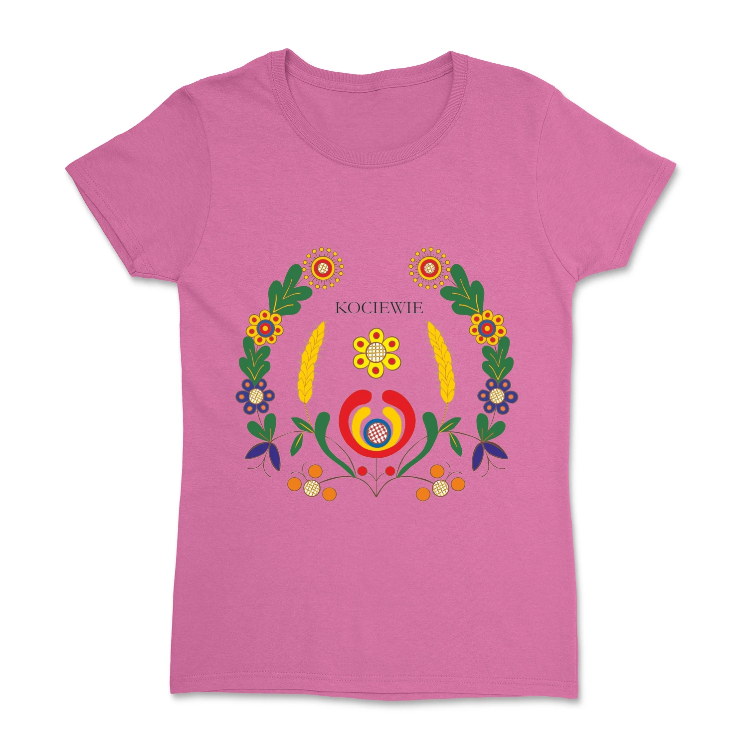 Damska koszulka z nadrukiem inspirowanym tradycyjnym haftem kociewskim oraz napisem „Kociewie”. Kolorowy, roślinny ornament nawiązuje do regionalnej sztuki ludowej, nadając koszulce wyjątkowy, folkowy charakter.