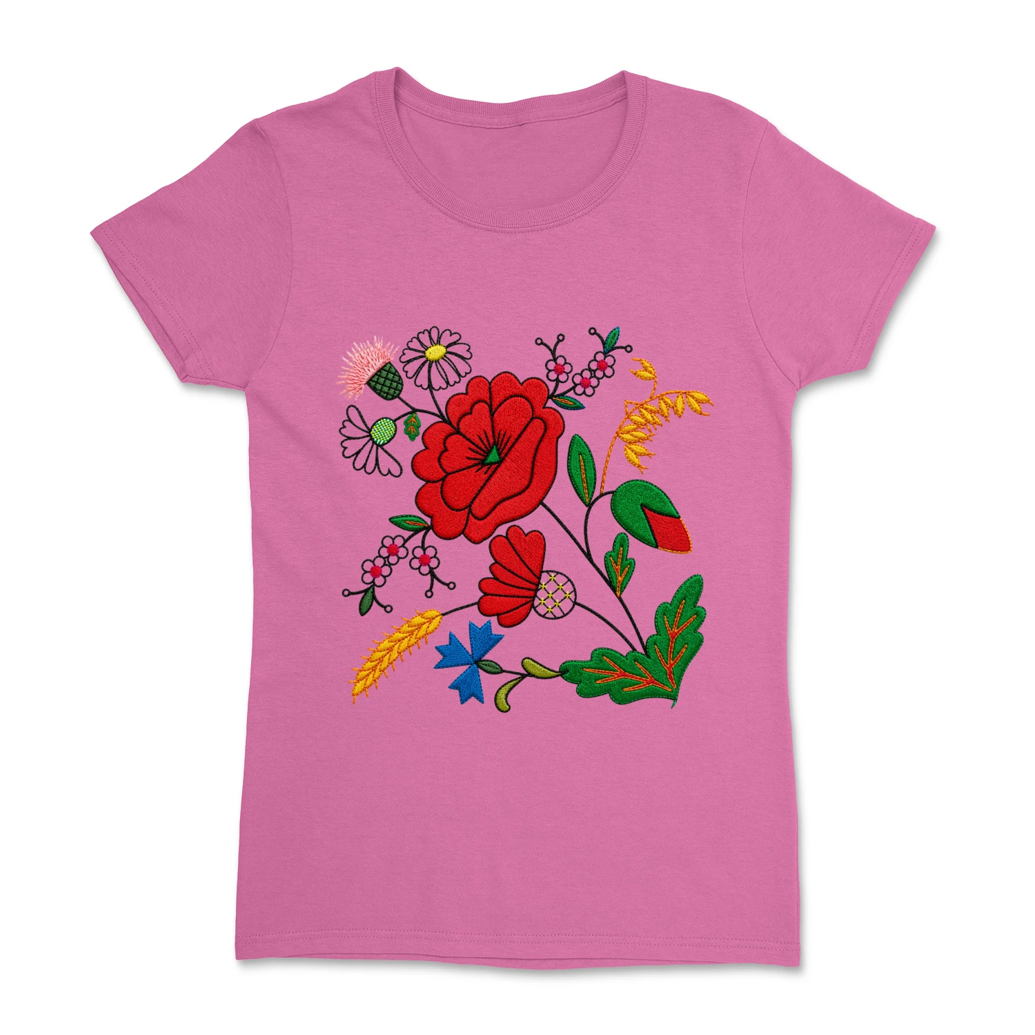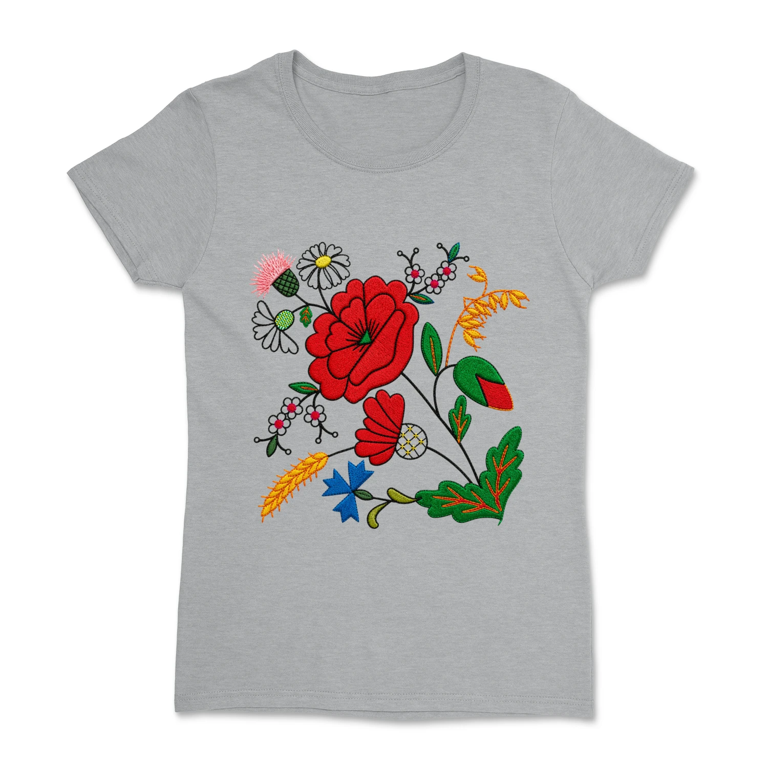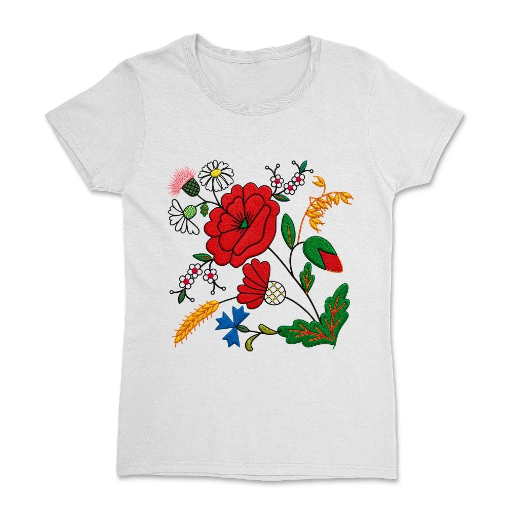 Damska koszulka z pięknym, kwiatowym wzorem inspirowanym tradycyjnym haftem kociewskim. Kolorowa kompozycja roślinnych ornamentów nawiązuje do regionalnej sztuki ludowej i nadaje koszulce wyjątkowy, folkowy charakter.
