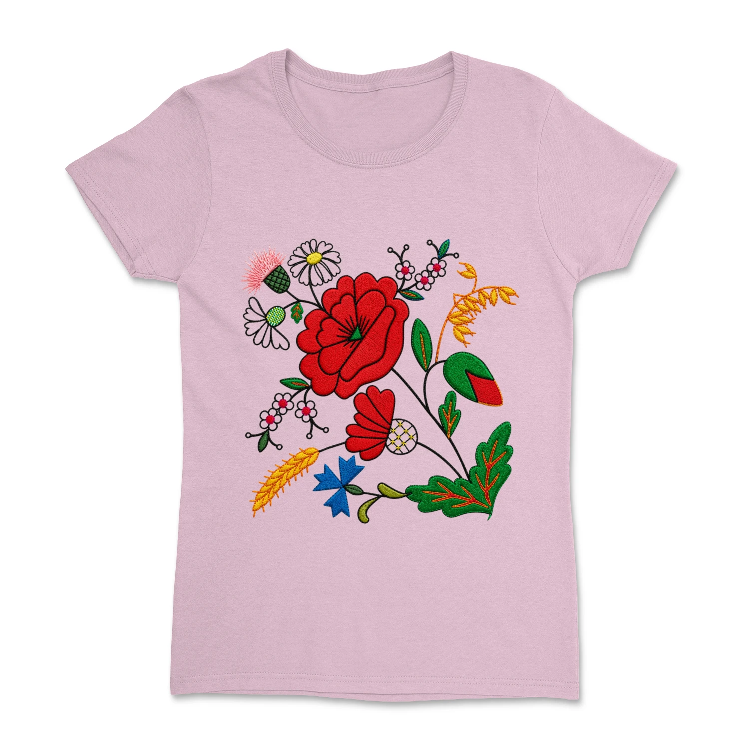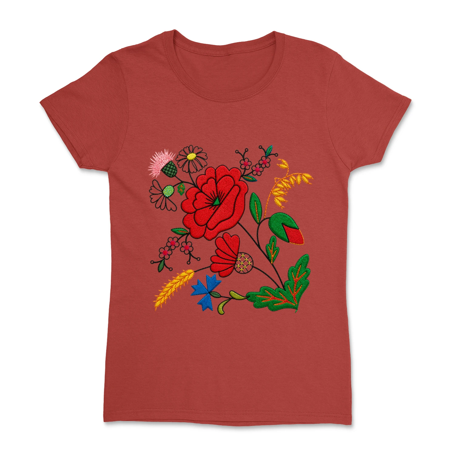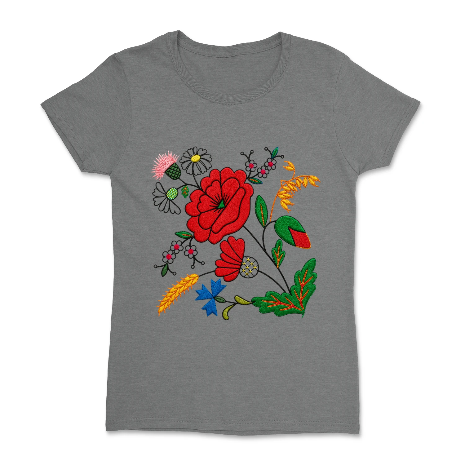 Damska koszulka z pięknym, kwiatowym wzorem inspirowanym tradycyjnym haftem kociewskim. Kolorowa kompozycja roślinnych ornamentów nawiązuje do regionalnej sztuki ludowej i nadaje koszulce wyjątkowy, folkowy charakter.