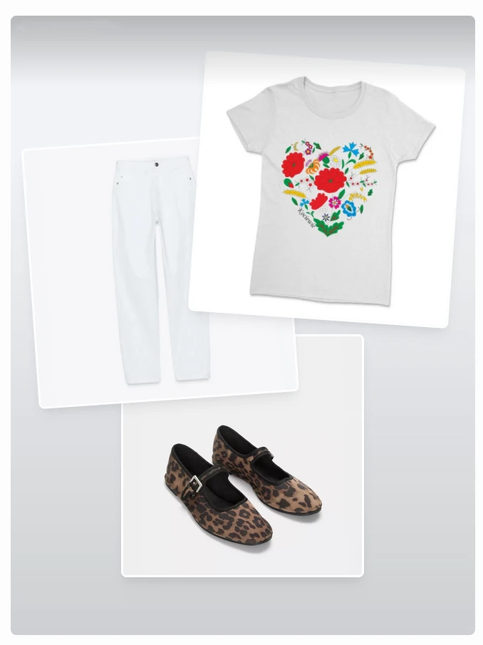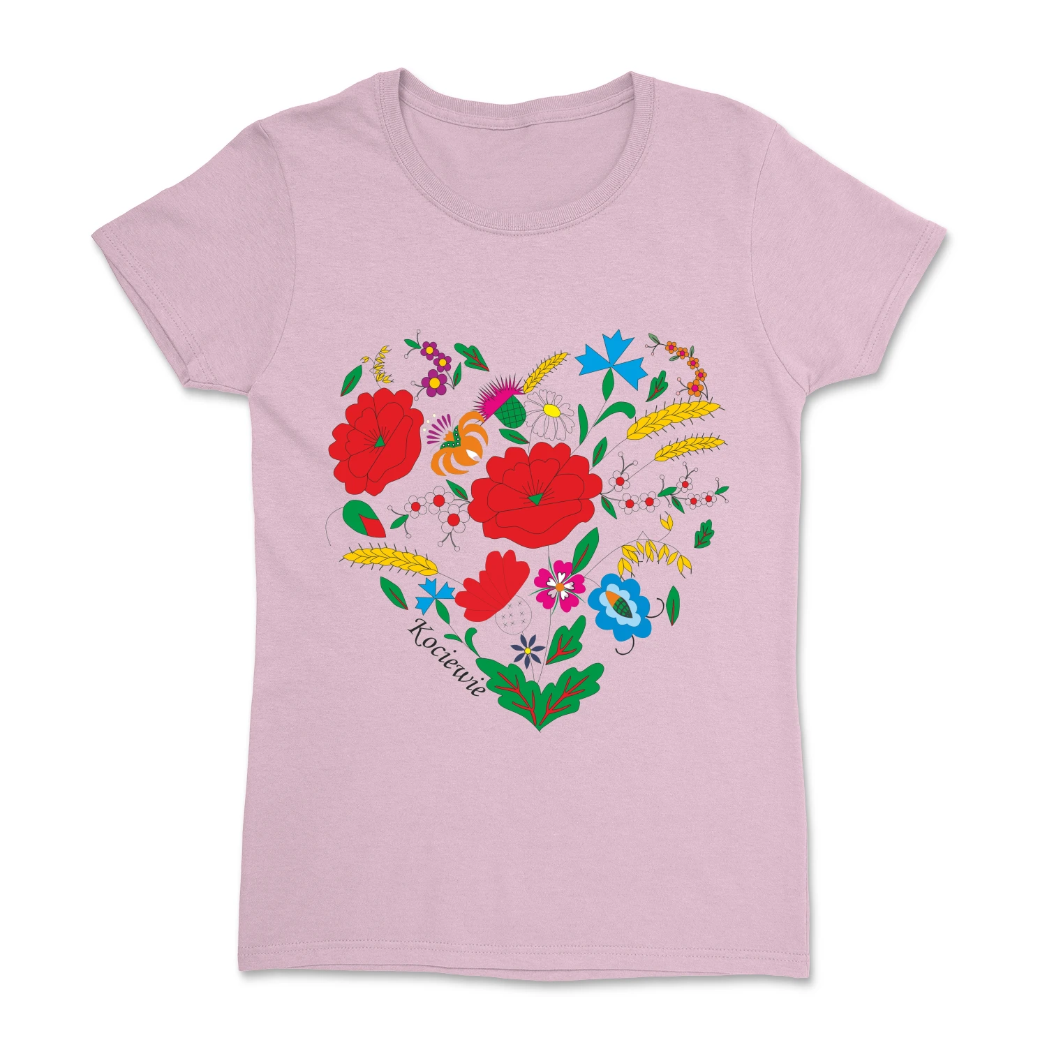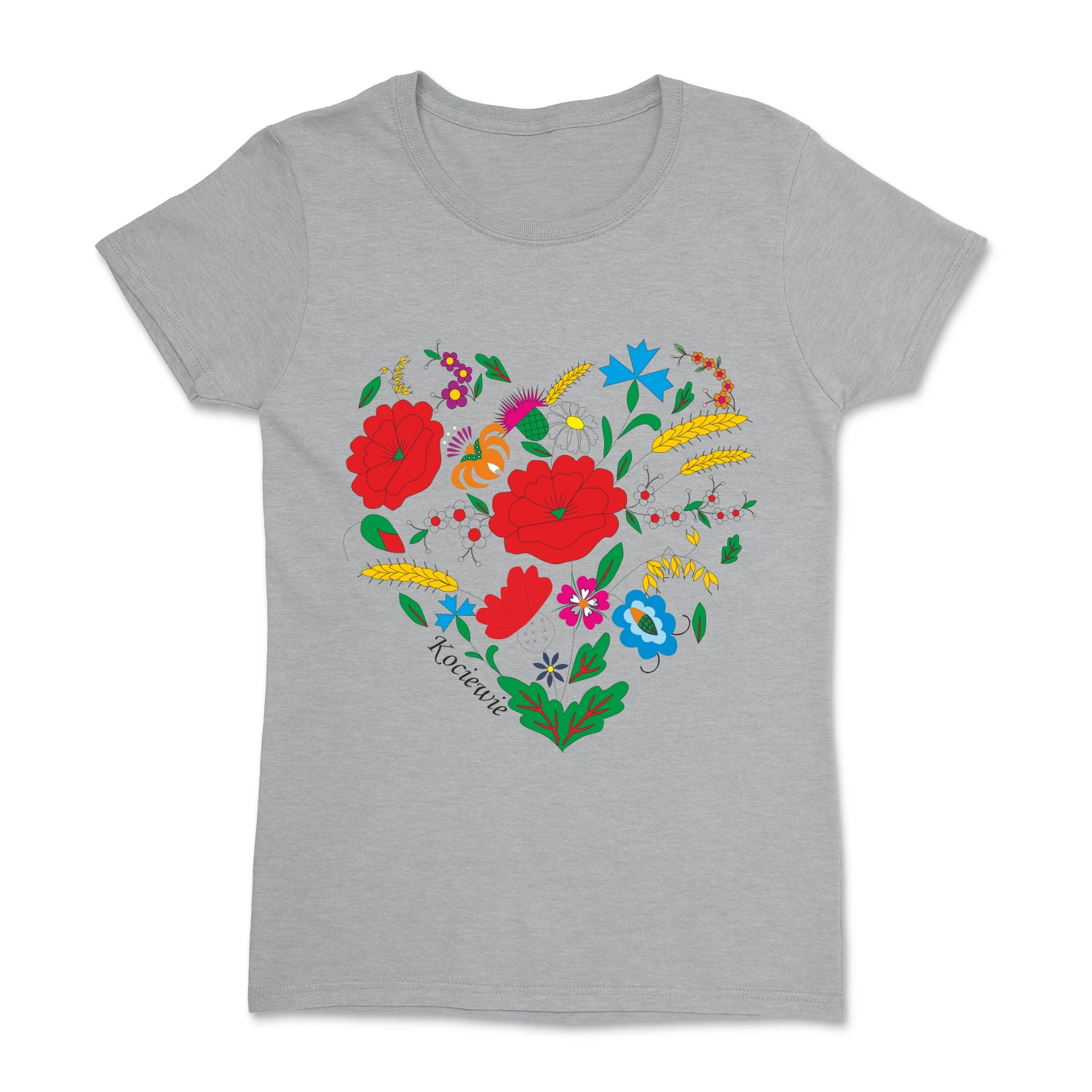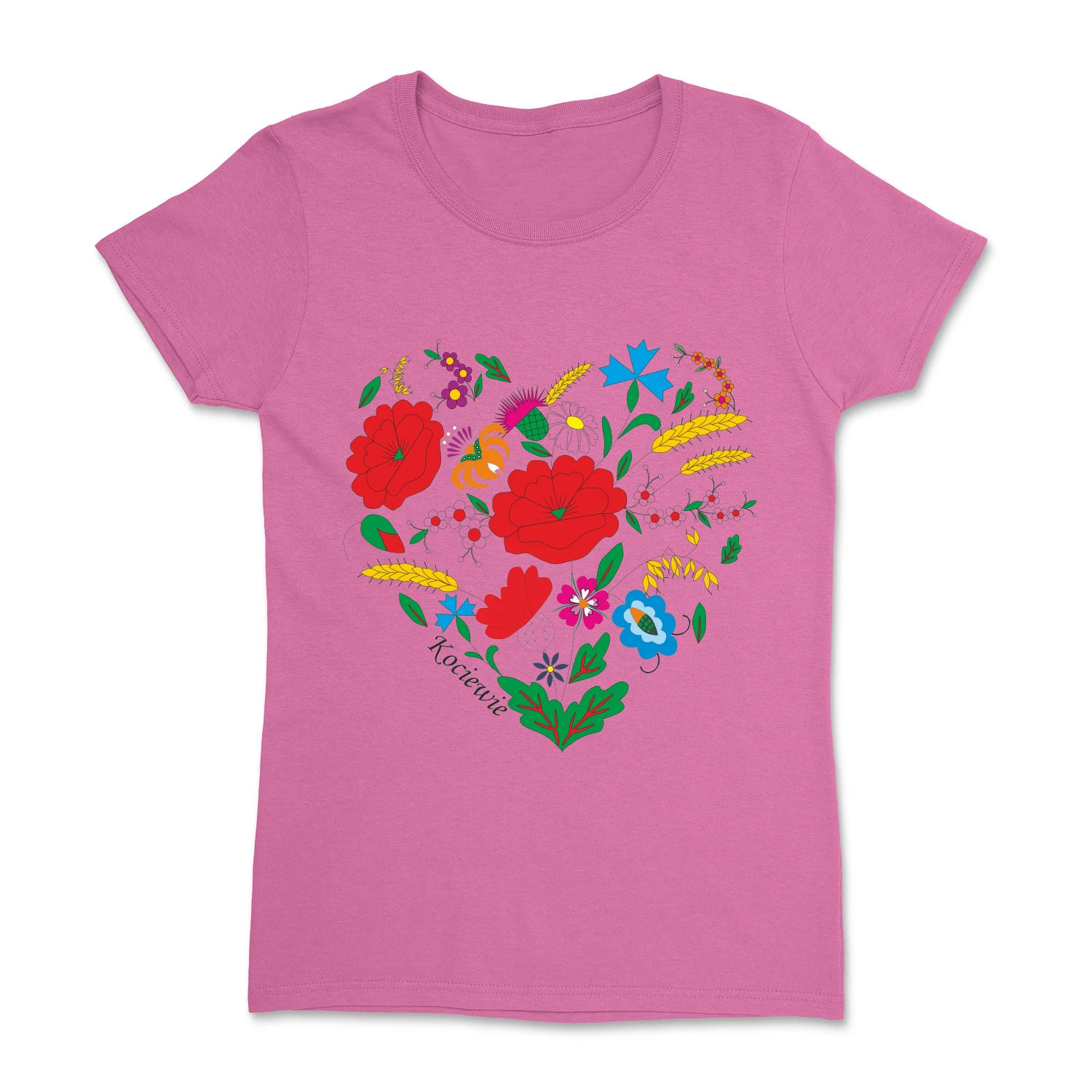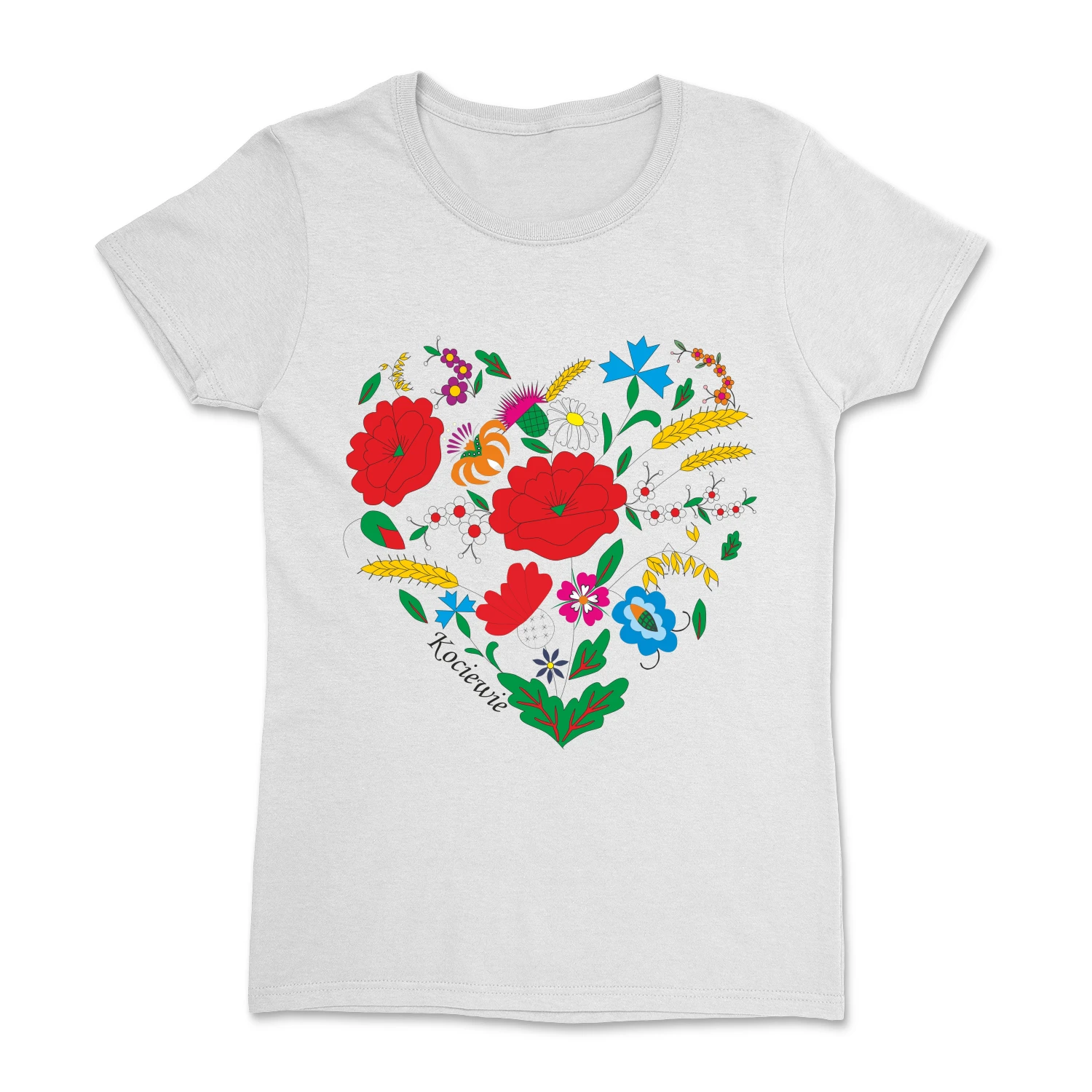 Wyjątkowa koszulka damska z motywem serca stworzonego z elementów haftu kociewskiego, inspirowanego tradycyjną teczką haftów Marii Wespowej. Kompozycja kwiatowych ornamentów w intensywnych kolorach tworzy unikalny, regionalny wzór, który podkreśla przywiązanie do kultury Kociewia. Całość dopełnia subtelny napis „Kociewie”.