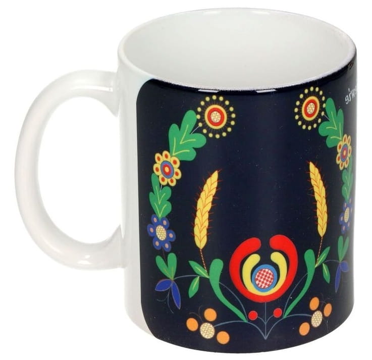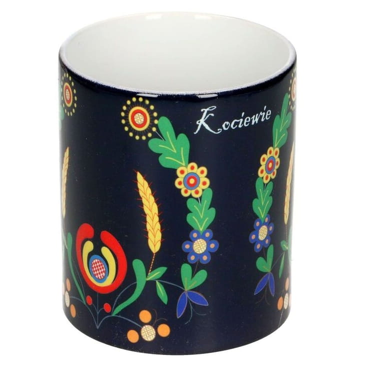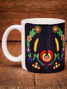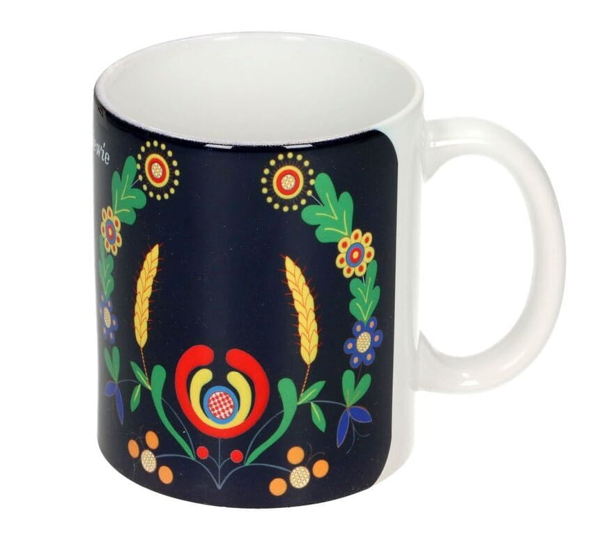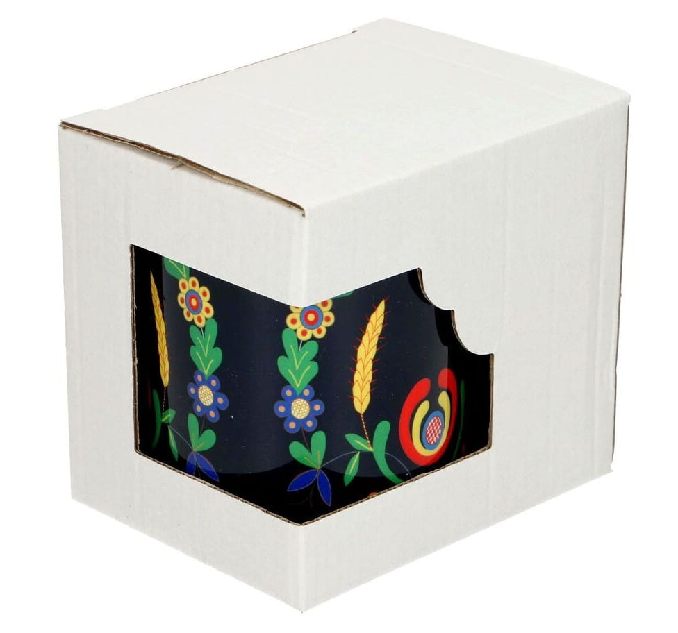 Kubek z pięknymi wzorami haftu kociewskiego na czarnym tle. Haft kociewski zawiera niezwykłe bogactwo ciekawych motywów polnych kwiatów i ornamentyki. Każdy kubek zapakowany jest w kartonowe pudełko z okienkiem. Świetnie nadaje się do domu i biura, idealny na folkowy prezent.