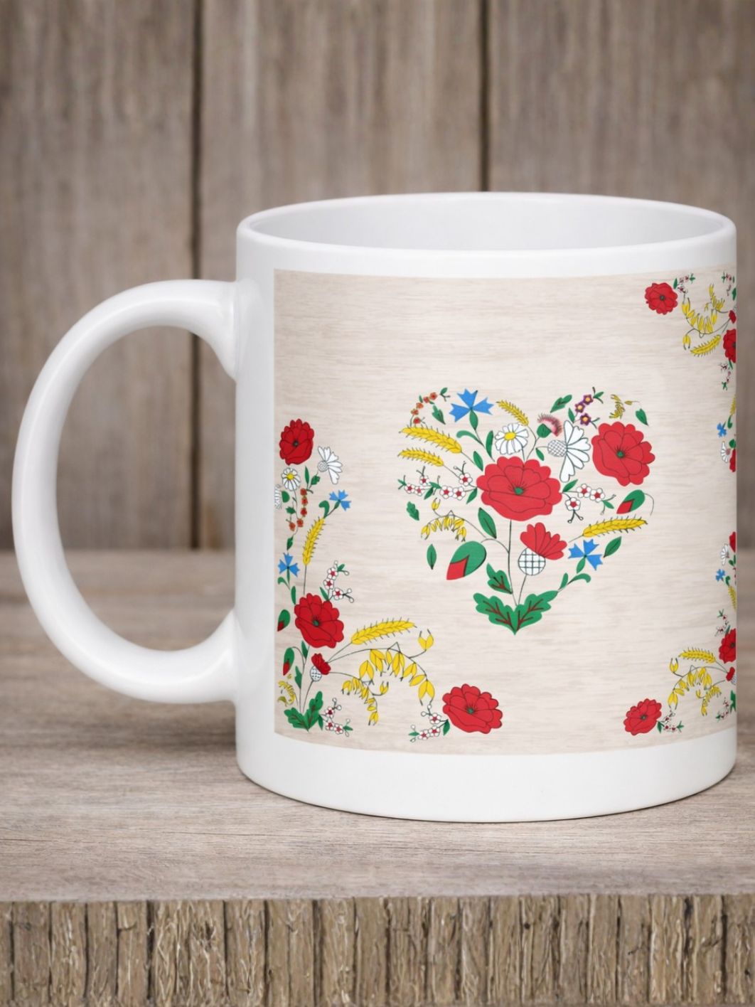 Kubek z dekoracyjnym wzorem inspirowanym haftami kociewskimi zwanymi haftem ziemi ze względu na dużą ilość elementów roślinnych. Wzornictwo kociewskie jest niezwykle charakterystyczne i nasycone bogactwem barw, gdzie na czele wysuwa się czerwień kociewskich maków.