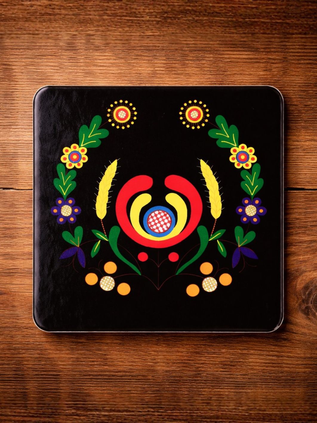 Podkładka pod kubek lub szklankę - z kociewskim motywem ludowym. Podkładka wykonana jest z korka oraz tektury. Podkładka pod kubek to mały element, który służy do ochrony powierzchni stołu lub innego mebla przed zarysowaniami, plamami i wysoką temperaturą. Może być wykonana z różnych materiałów, takich jak drewno, korek, ceramika, szkło, silikon czy tworzywa sztuczne. Podkładki pod kubki często mają różne wzory i kolory, co pozwala na dopasowanie ich do stylu wnętrza. Mogą być też praktycznym elementem dekoracyjnym. Wiele osób używa podkładek nie tylko w domu, ale także w biurach czy podczas różnych wydarzeń, aby dodać elegancji i ochronić powierzchnie.