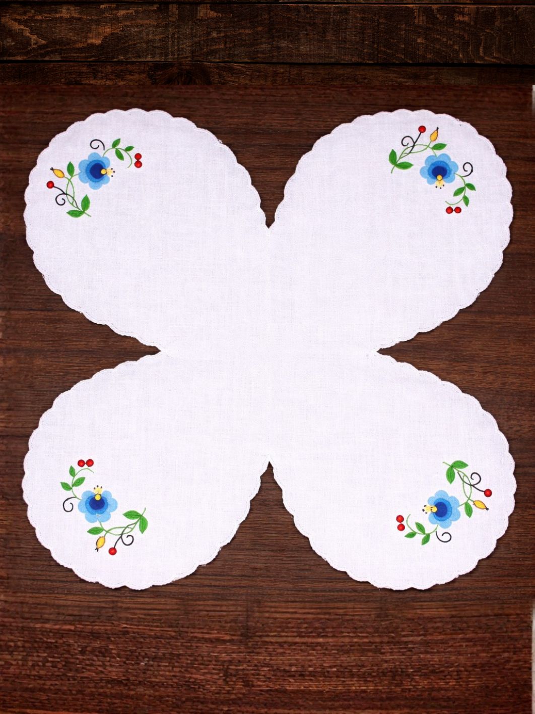 Haftowana serweta do koszyczków wielkanocnych z tradycyjnym wzorem kaszubskim - szkoły żukowskiej. Serwetki bardzo ładnie prezentują się w koszyczkach świątecznych, do których idealnie dopasowują się dzięki swoim charakterystycznym wycięciom jak również rozłożone na stole.