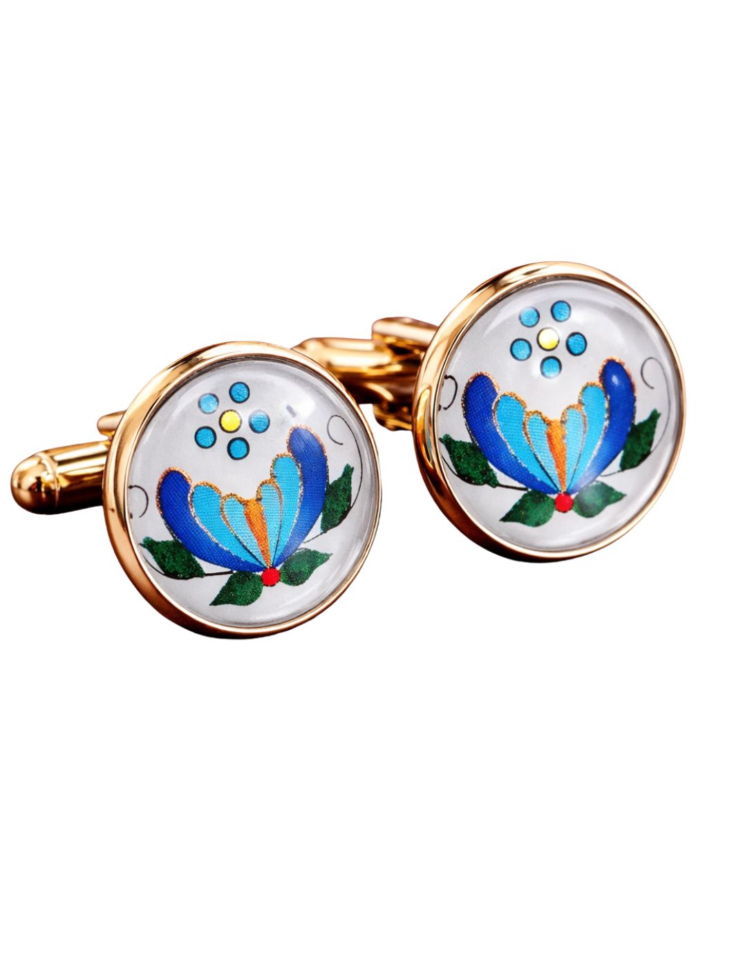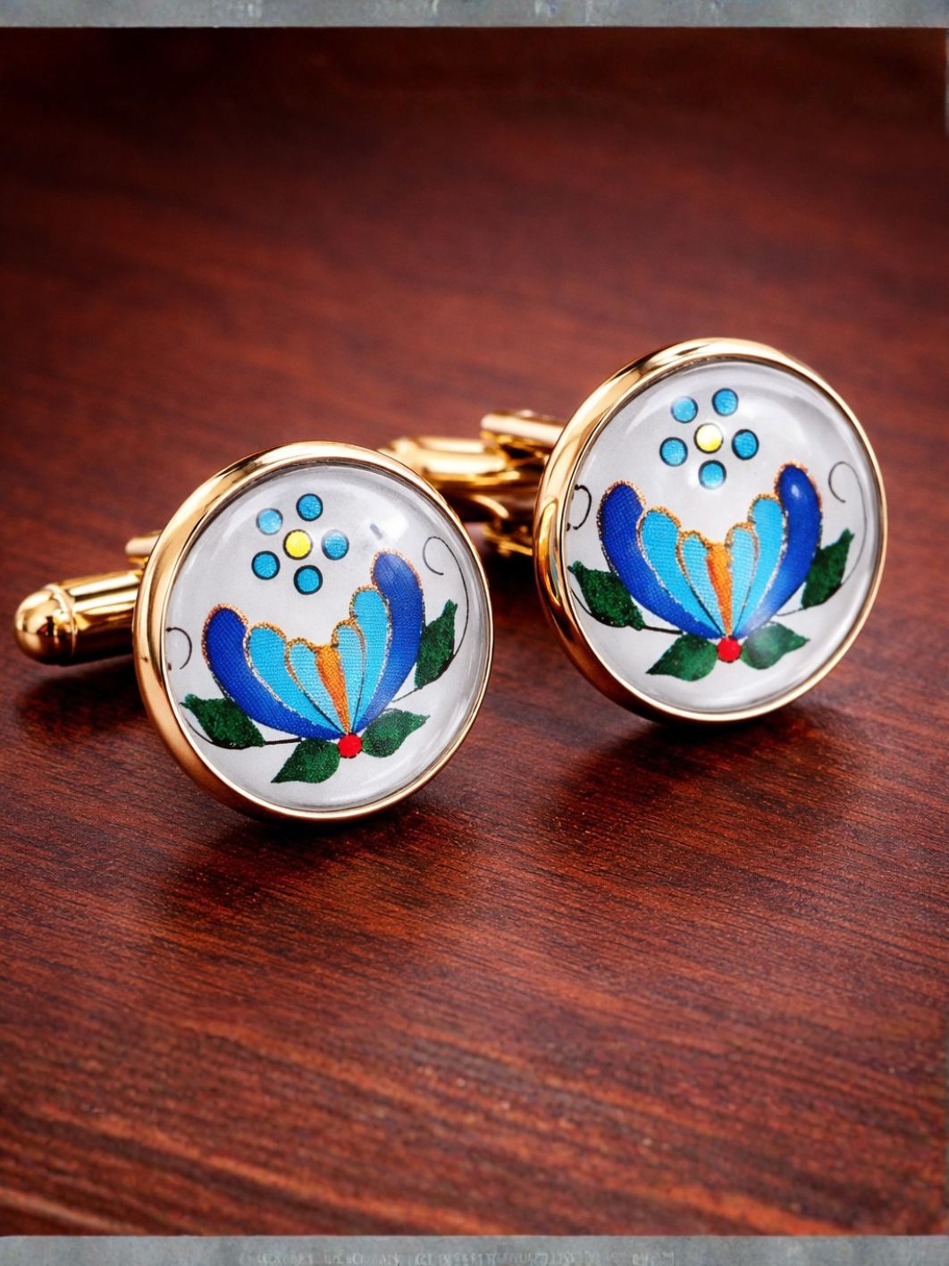 Spinki do mankietów z grafiką kaszubskiej palmety - popularnego wzoru kaszubskiego haftu. Motyw przedstawia stylizowany kwiat kaszubski. Wzór zabezpieczony szklaną soczewką. Jasne tło. Wykonane ze stali.