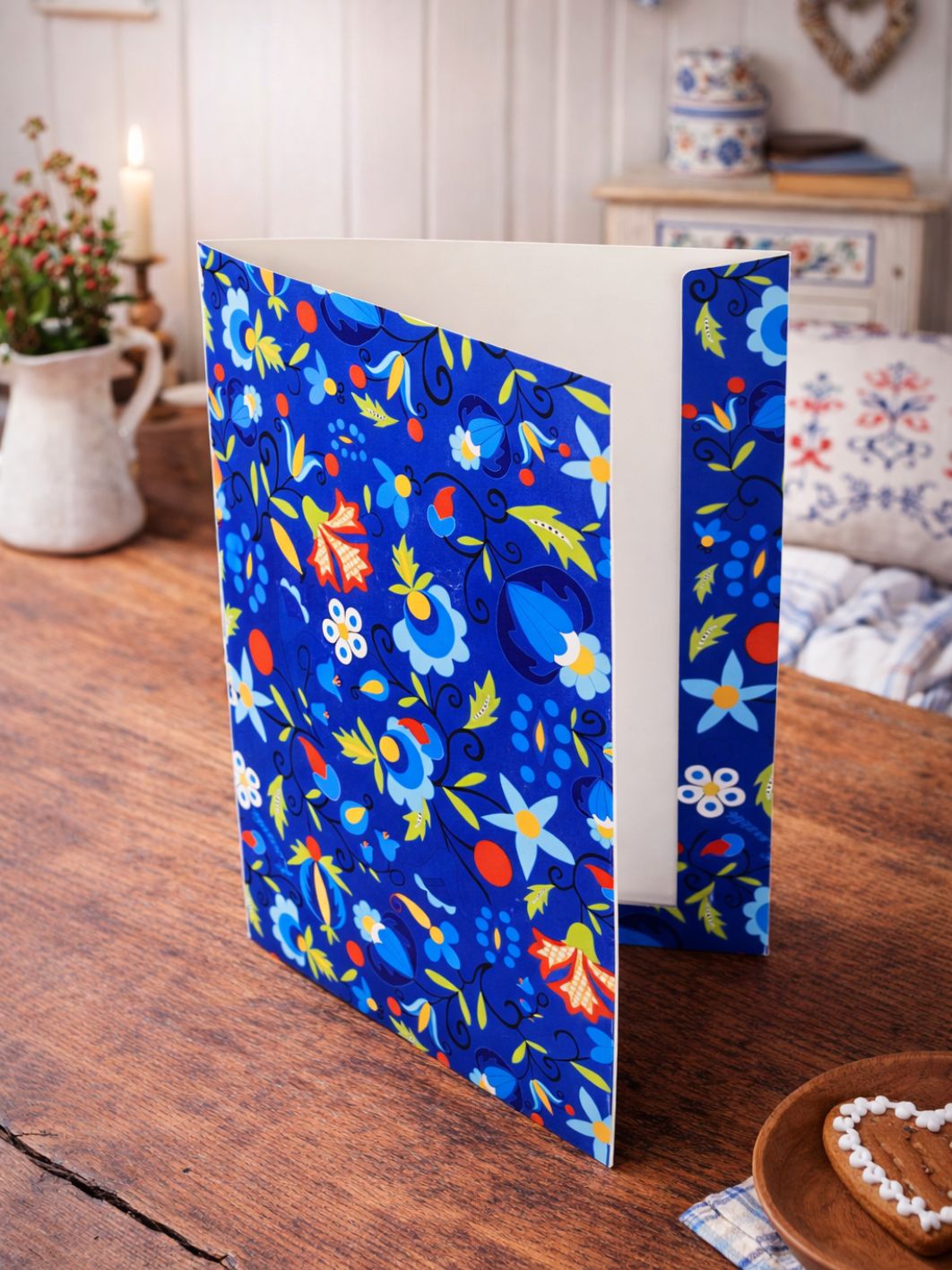 Teczka biurowa z zakładką. Format A4. Wykonana z kartonu z trzema zakładkami zabezpieczającymi dokumenty przed wypadnięciem. Piękne wzornictwo haftu kaszubskiego, szkoły żukowskiej.