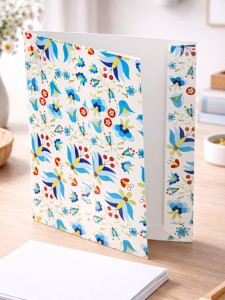 Teczka biurowa z zakładką. Piękne wzornictwo haftu kaszubskiego - szkoły wejherowskiej. Wykonana z kartonu z trzema zakładkami zabezpieczającymi dokumenty przed wypadnięciem. Cena dotyczy jednej sztuki.