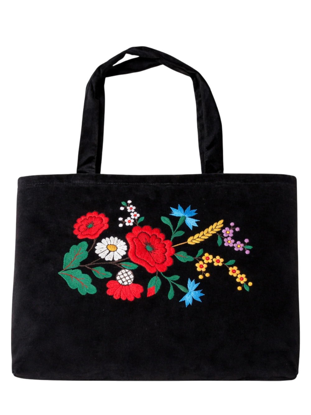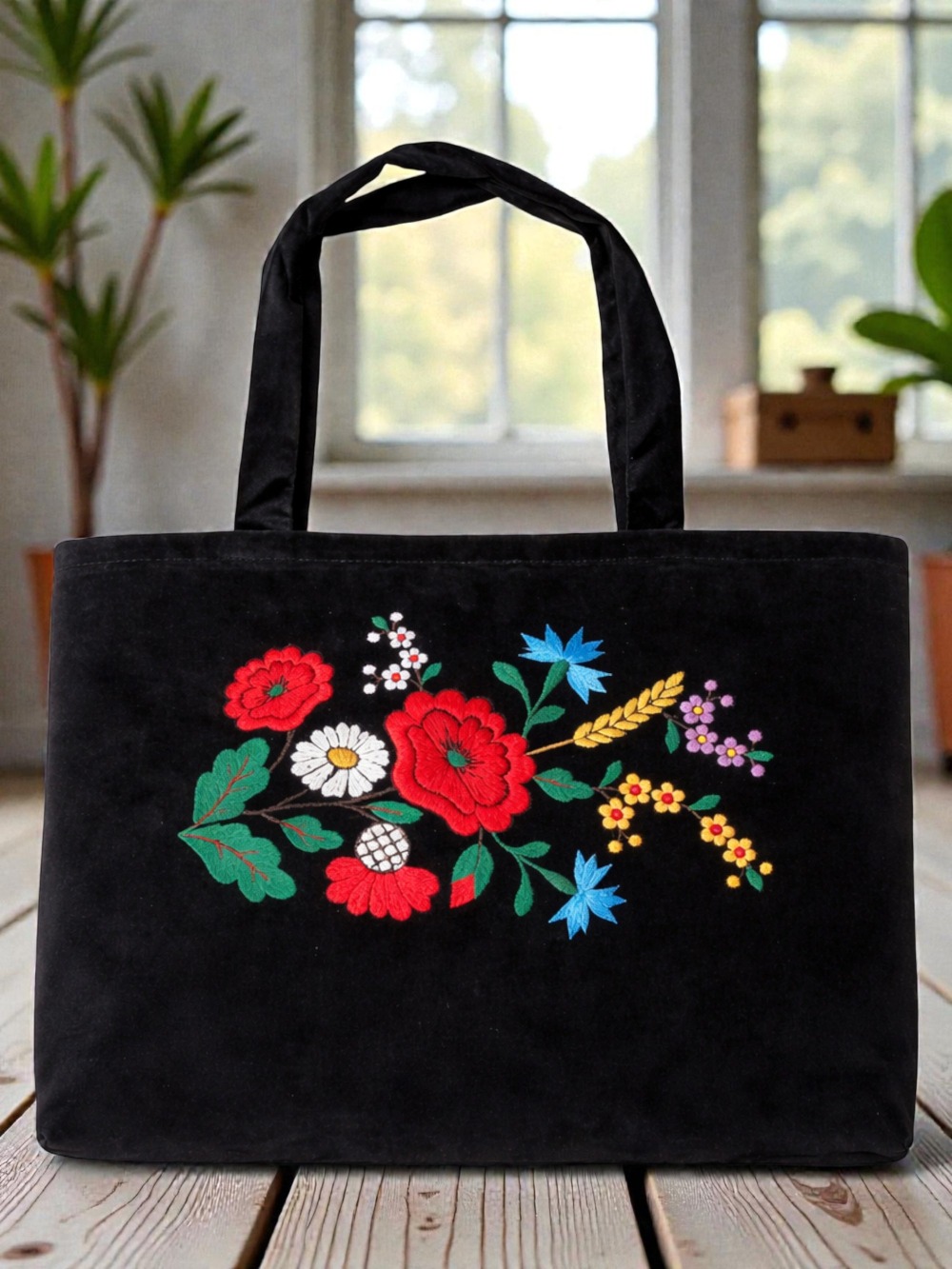 Torebka haftowana na ramię, z haftowanymi wzorami haftu kociewskiego. Ta elegancka czarna torebka wyróżnia się pięknym, folkowym wzornictwem, które dodają jej uroku i wyjątkowości. Została starannie wykonana z wysokiej jakości materiałów, które zapewniają jej trwałość i odporność w codziennym użytkowaniu. Jest wygodna w noszeniu na ramieniu. Zamykanie na suwak zapewnia bezpieczeństwo przechowywanych przedmiotów. Wewnątrz wszyte dodatkowe kieszenie.