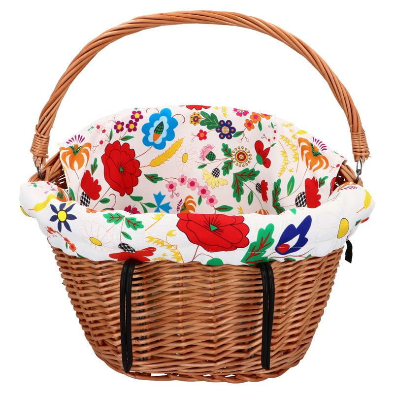 Wkład do koszyka rowerowego lub kosza na zakupy, zdobiony kociewskimi wzorami folkowymi. Rozmiar uniwersalny - pasuje do większości koszy rowerowych dostępnych na rynku. Rodzaj materiału: odporna na ścieranie codura o gramaturze 190 g. Posiada paski służące do przymocowania do kosza.