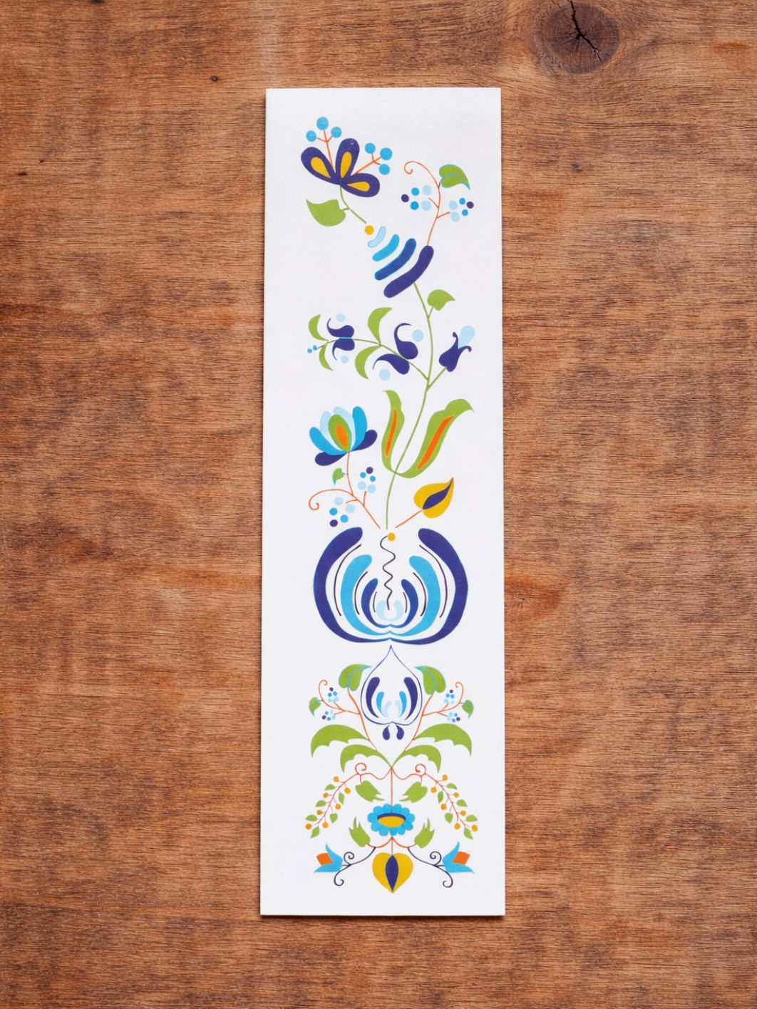 Zakładka z kompozycją wzorów słupskich. Jedna strona przedstawia tradycyjny haft kaszubski szkoły słupskiej. Druga strona zakładki zawiera opis charakterystycznych cech haftu. Idealny dodatek do kompletu z książką.