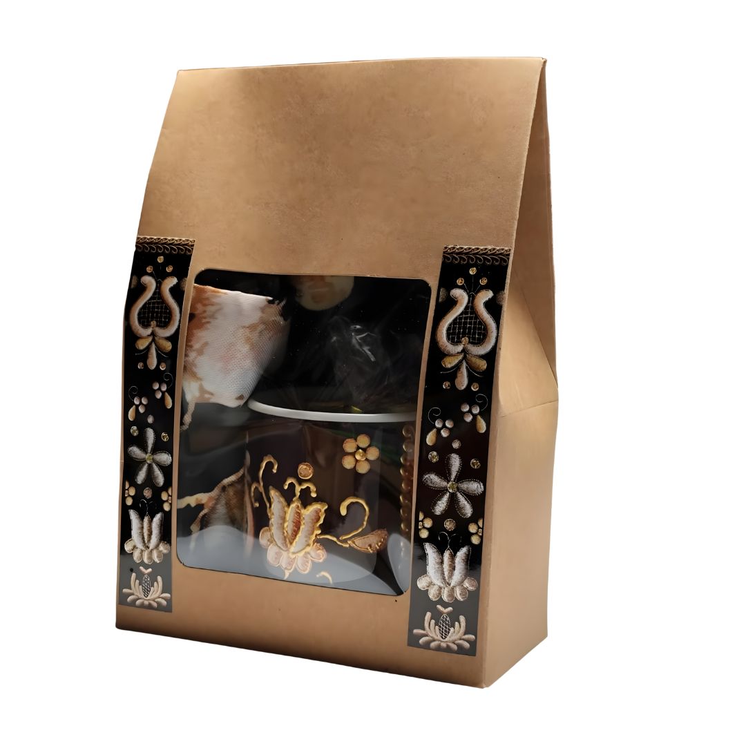Zestaw kuchenny „Złotnica” to elegancki komplet w folkowym stylu inspirowanym haftem kaszubskim szkoły czepcowej. Zawiera fartuszek, kubek i świeczkę – idealny prezent dla miłośników tradycji i rękodzieła z Pomorza.